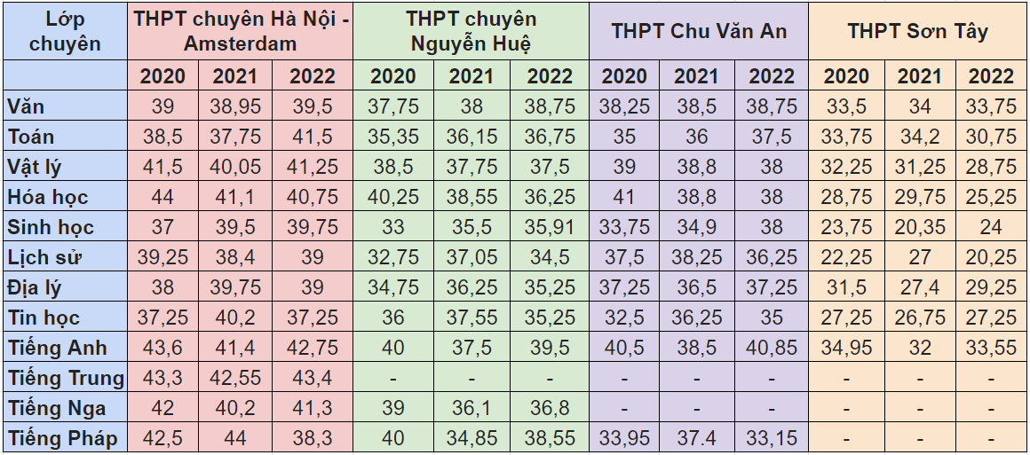 Dưới đây là điểm chuẩn các lớp chuyên trong ba năm 2020-2022 để phụ huynh và học sinh tham khảo khi đặt nguyện vọng:
